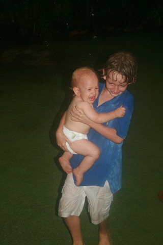 Fergus was enjoying the showers yesterday and though his brother would too – mistake!